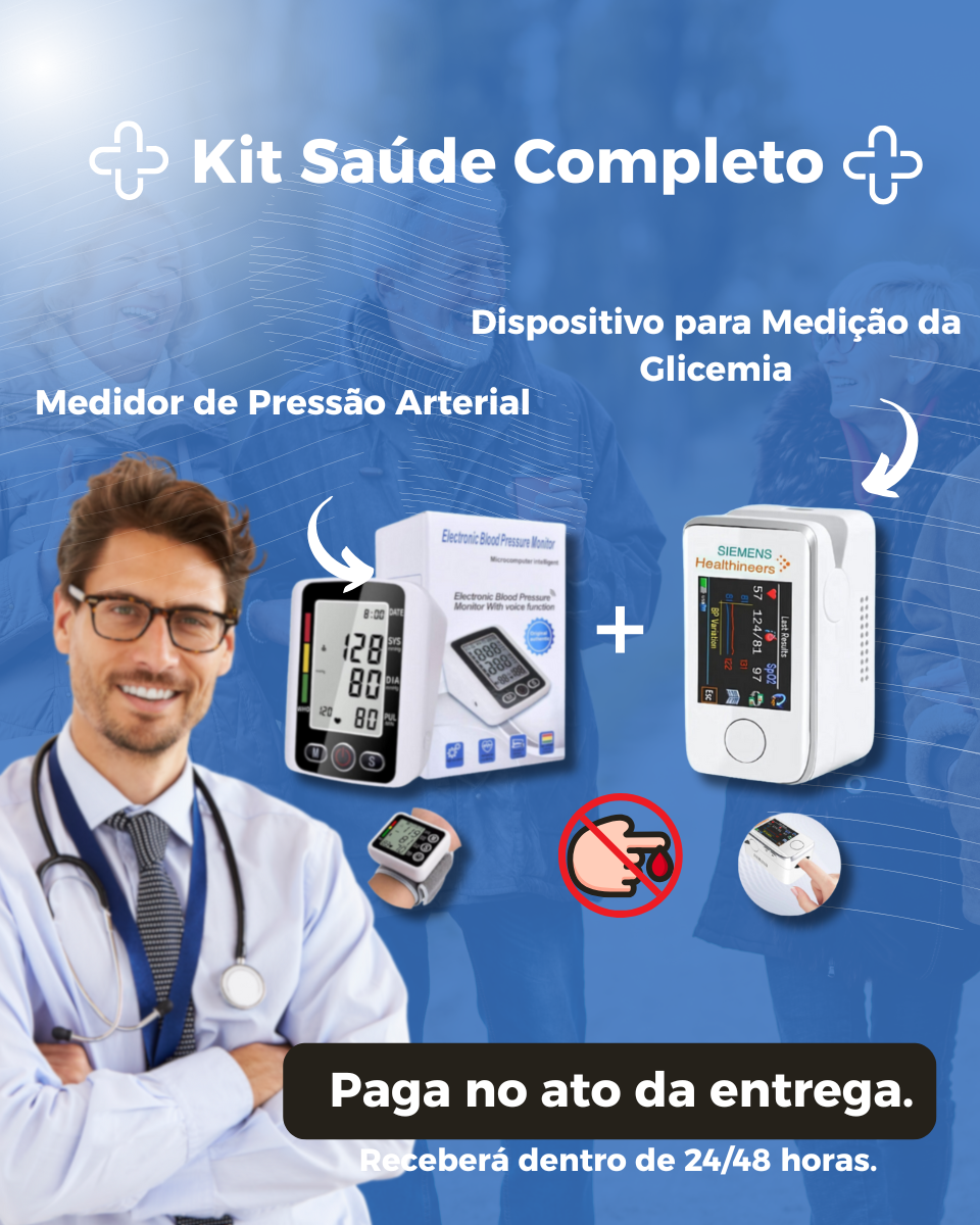 Medidor de glicose no sangue multifuncional + Tensiómetro eletrónico – COMPRA 1 E RECEBE OUTRO GRÁTIS